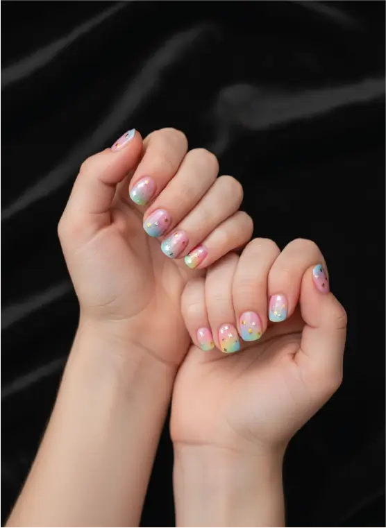 Cuticle soak, nails cut and shaped, cuticle trim, hand massage and polish.